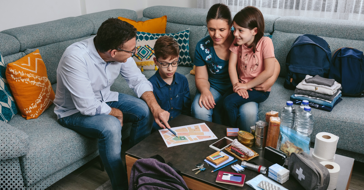 Family reviewing an emergency plan with supplies laid out on a table.